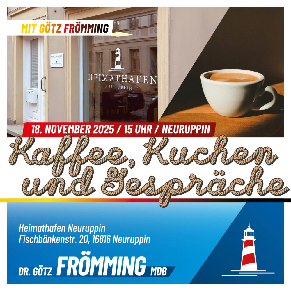 Am 18. November 2025 um 15 Uhr lade ich Sie herzlich zu Kaffee, Kuchen und Gesprächen in den Heimathafen Neuruppin ein. Ich freue mich auf den persönlichen Austausch in gemütlicher Atmosphäre – über Politik, aktuelle Themen oder einfach über das, was Sie bewegt.