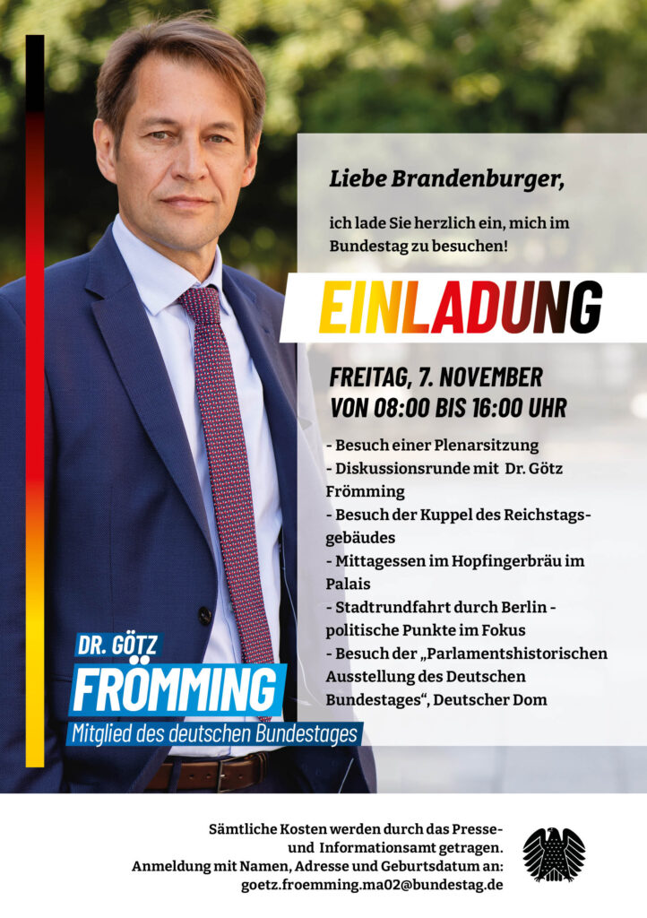 In den letzten Tagen vor der Bundestagswahl am Sonntag ist Ihr AfD-Direktkandidat, Rainer Galla, überall im Land unterwegs: Sie treffen ihn Freitagvormittag am Markt in Storkow und am Nachmittag in Frankfurt (Oder). Kommen Sie vorbei! Auf ein Gespräch, Infomaterial, Aufkleber, Kugelschreiber und und und …
