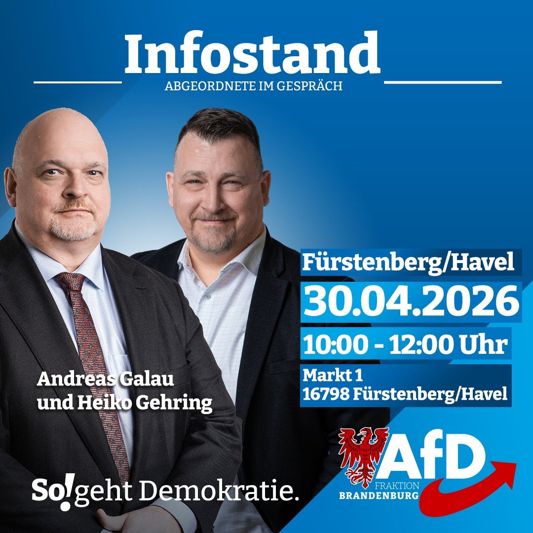 Infostand in Fürstenberg/Havel 🏛️ Von 10:00 bis 12:00 Uhr findet der erste Infostand am Markt 1 statt. Vor Ort stehen die Abgeordneten Andreas Galau und Heiko Gehring für den direkten...