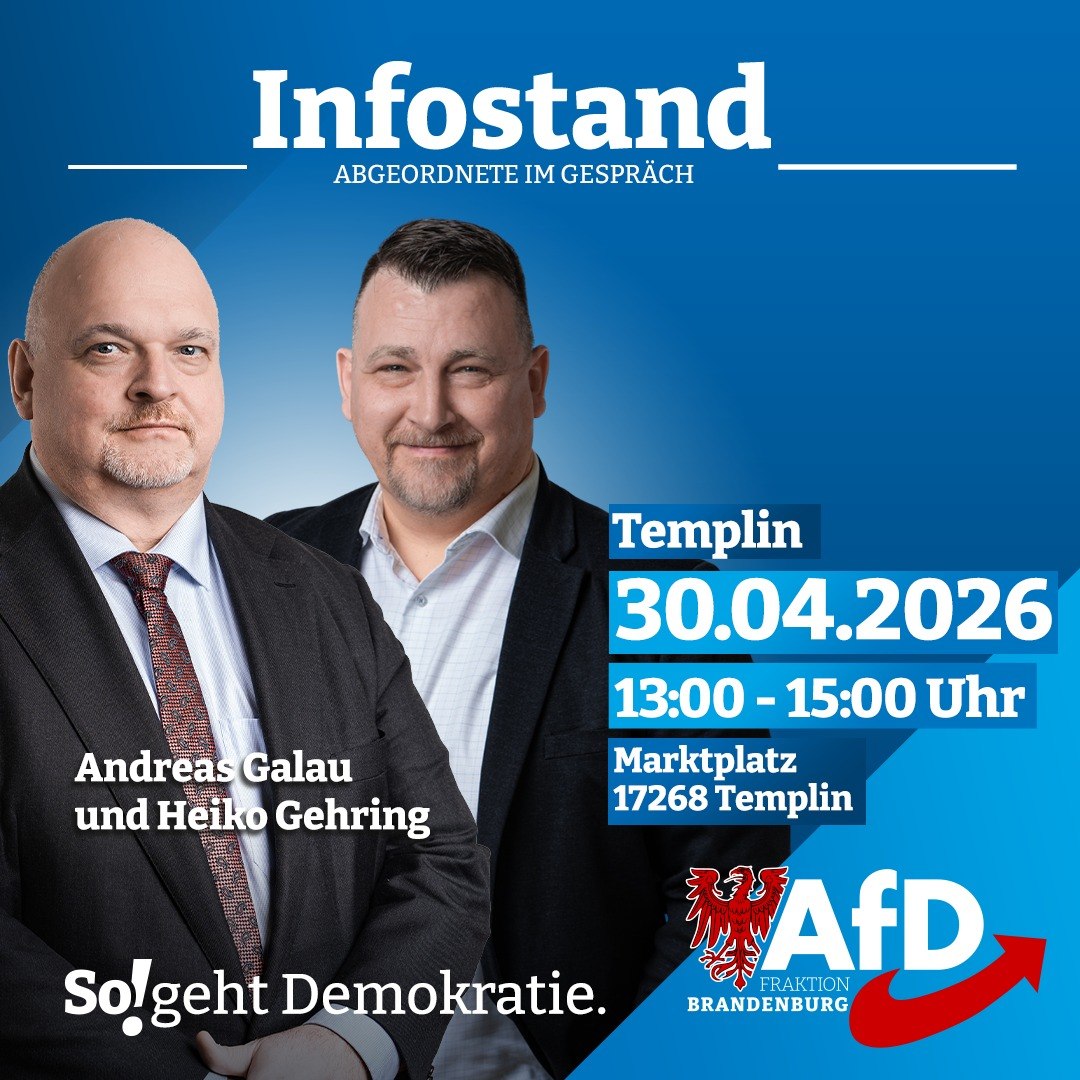 Infostand in Templin 🏛️ Anschließend stehen wir von 13:00 bis 15:00 Uhr am Marktplatz für Gespräche bereit. Vor Ort stehen die Abgeordneten Andreas Galau und Heiko Gehring für den direkten...